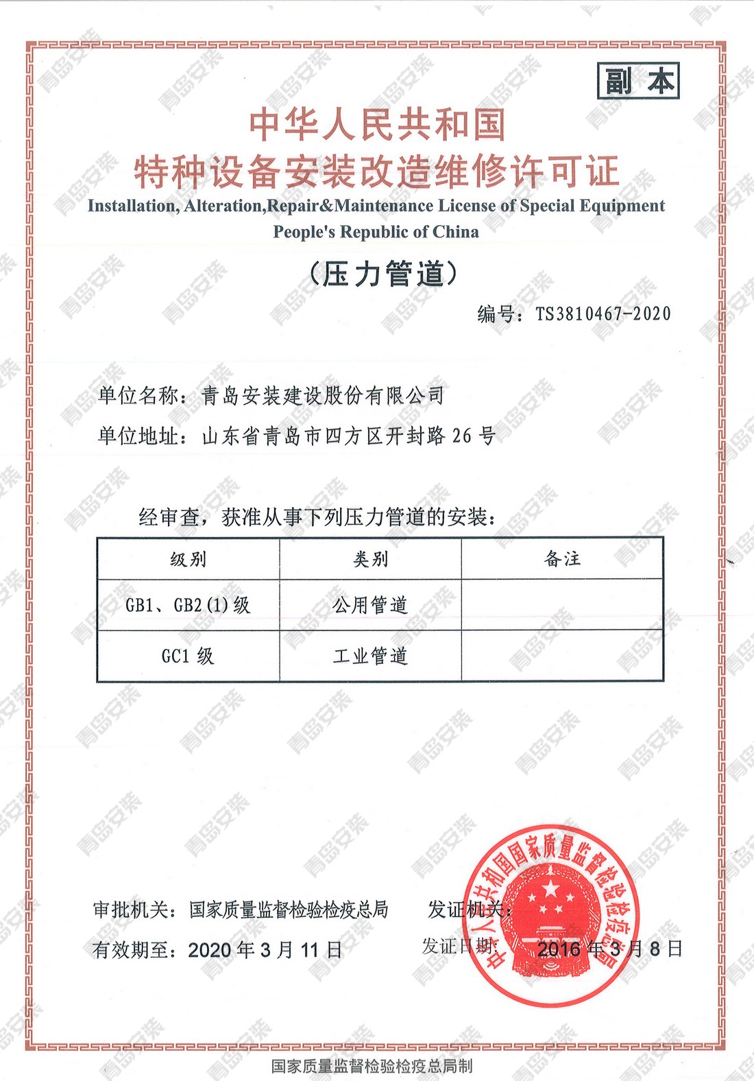 特種設備安裝改造維修許可證-壓力管道