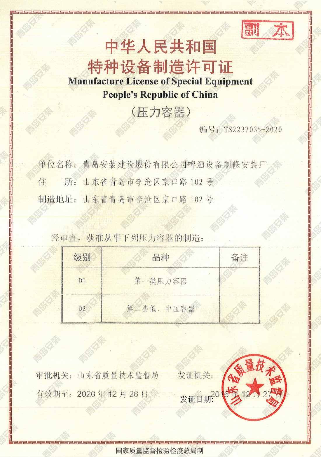 特種設備安裝改造維修許可證-壓力容器