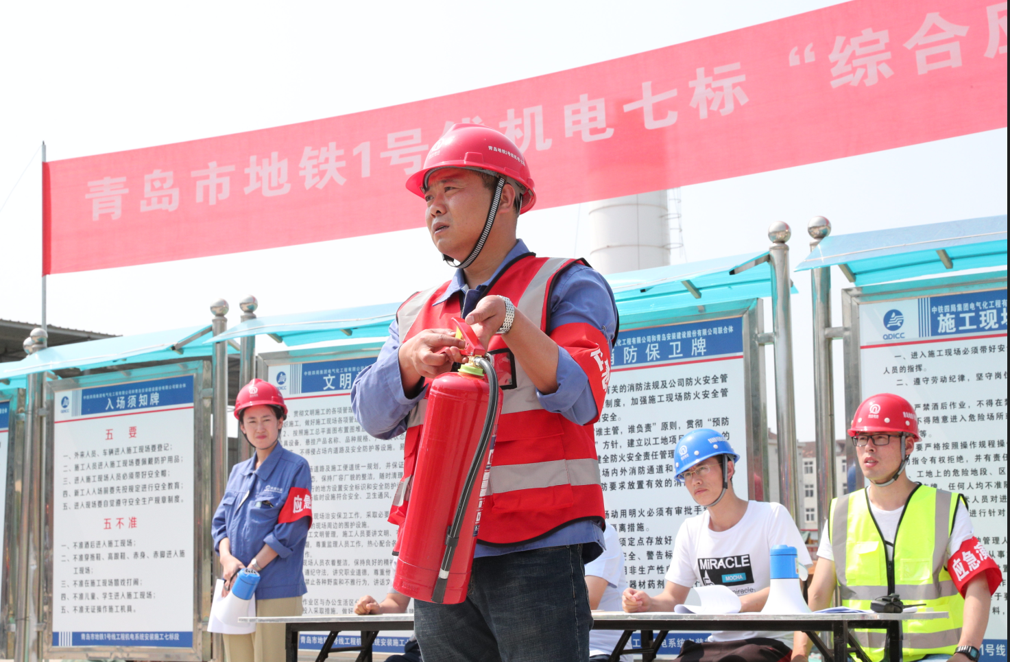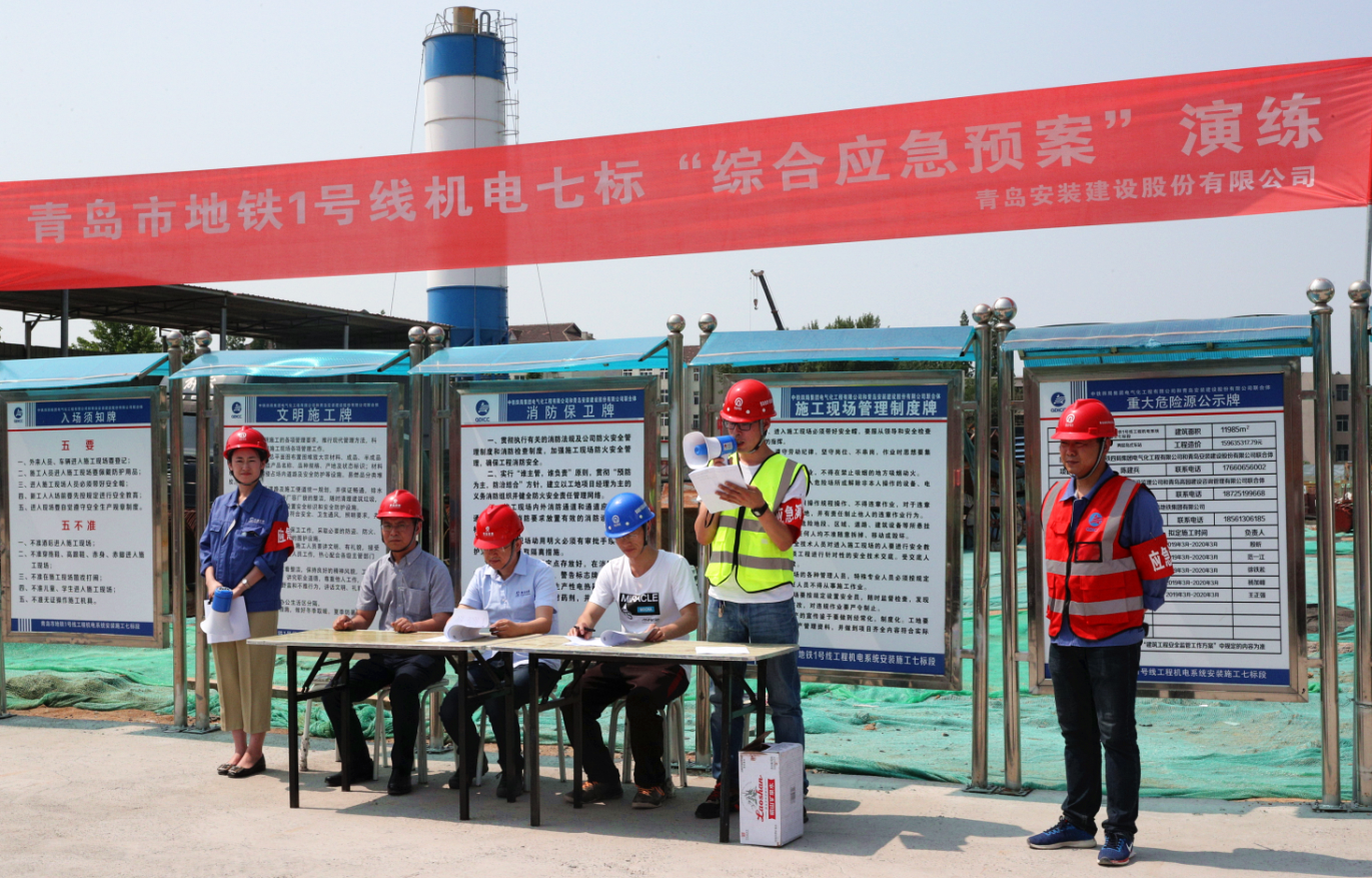 為扎實(shí)開展2019年“安全生產(chǎn)月”活動(dòng),牢固樹立“生命至上,安全生產(chǎn)”理念,全面提升安全生產(chǎn)事故應(yīng)急救援處置能力,2019年6月14日下午,我公司聯(lián)合中鐵四局地鐵項(xiàng)目部在青島市地鐵1號(hào)線工程機(jī)電系統(tǒng)施工七標(biāo)段遵義路站站區(qū)開展了一次以“防風(fēng)險(xiǎn) 除隱患 遏事故”為主題的安全生產(chǎn)事故應(yīng)急救援綜合演練活動(dòng),公司黨委書記、常務(wù)副總經(jīng)理張衛(wèi)財(cái)出席活動(dòng),安環(huán)部主任馬世革、中鐵四局、監(jiān)理公司、各分公司負(fù)責(zé)安全生產(chǎn)的副經(jīng)理、專職安全員及安環(huán)部全體人員共計(jì)80余人到現(xiàn)場(chǎng)觀摩演練。中鐵四局青島地鐵1號(hào)線機(jī)電七標(biāo)項(xiàng)目經(jīng)理劉洋擔(dān)任演練總指揮。公司商務(wù)經(jīng)理姜曉紅擔(dān)任主持人。